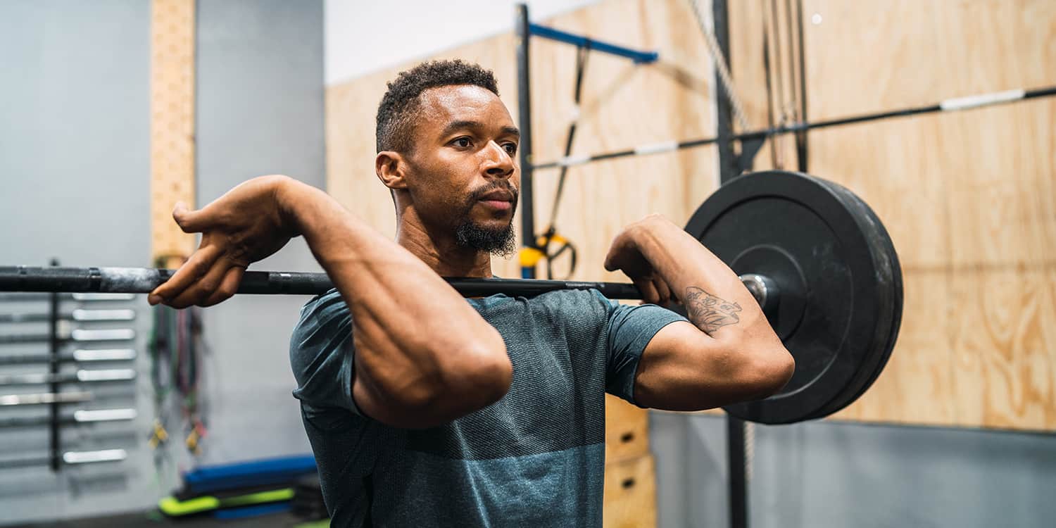 read more 5-Day Upper Body Split Workout: A Training Plan for Strength Man performing a standing overhead press with a barbell in a 5 day upper body split workout.